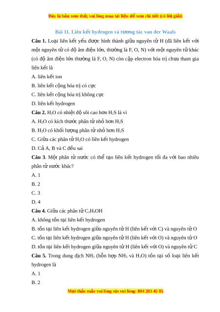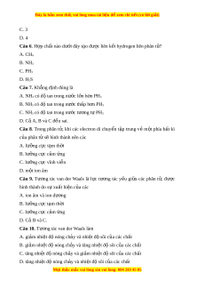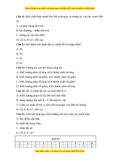 Đây là bản xem th , vu ử i lòng mua tài li u ệ đ xe ể m chi ti t ế (có l i ờ gi i ả ) Câu 11. B n ả ch t ấ hình thành liên k t ế hydrogen và tư ng ơ tác van der waals đ u ề do A. s góp chung ự electron B. sự như ng – nh ờ n ậ electron C. tư ng ơ tác hút tĩnh đi n ệ D. Cả A, B và C đ u s ề ai Câu 12. Khí hi m ế nào dư i ớ đây có nhi t ệ độ sôi th p nh ấ t ấ ? A. Ne B. Xe C. Ar D. Kr Câu 13. Tư ng