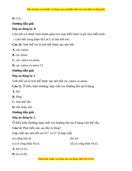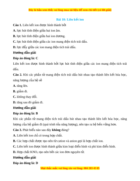 Đây là bản xem th , vu ử i lòng mua tài li u ệ đ xe ể m chi ti t (c ế ó l i ờ gi i ả ) Bài 10: Liên k t ế ion Câu 1. Liên k t ế ion đư c hì ợ nh thành b i ở A. l c ự hút tĩnh đi n gi ệ a hai ữ ion âm. B. l c hút ự tĩnh đi n g ệ i a ữ hai ion dư ng. ơ C. l c ự hút tĩnh đi n gi ệ a các ữ ion mang đi n t ệ ích trái d u. ấ D. l c ự đ y gi ẩ a ữ các ion mang đi n t ệ ích trái d u. ấ Hư ng d ớ ẫn gi i ả Đáp án đúng là: C Liên k t ế ion đư c ợ hình thành b i ở l c ự hút tĩnh đi n ệ gi a ữ các ion mang đi n ệ tích trái dấu. Câu 2. Khi các ph n ầ tử mang đi n ệ tích trái d u ấ hút nhau t o ạ thành liên k t ế hóa h c, ọ năng lư ng ợ c a h ủ s ệ ẽ A. tăng lên. B. gi m ả đi. C. không thay đổi. D. tăng sau đó gi m ả đi. Hư ng d ớ ẫn gi i ả Đáp án đúng là: B Khi các ph n ầ tử mang đi n ệ tích trái d u ấ hút nhau t o ạ thành liên k t ế hóa h c, ọ năng lư ng ợ c a h ủ gi ệ m ả đi (quá trình t a ỏ năng lư ng) ợ , nên t o r ạ a h b ệ n v ề ng h ữ n. ơ