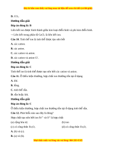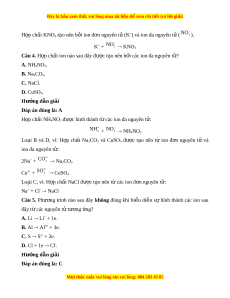 ử K ) và ion đa nguyên t ( ử 3 ). K+ + NO3 KNO3 Câu 4. H p ợ ch t ấ ion nào sau đây đư c ợ t o nên ạ b i ở các ion đa nguyên t ? ử A. NH4NO3. B. Na2CO3. C. NaCl. D. CuSO4. Hư ng d ớ ẫn gi i ả Đáp án đúng là: A H p ợ ch t ấ NH4NO3 đư c hì ợ nh thành t các ừ ion đa nguyên t : ử NH NO 4 + 3 NH4NO3 Lo i ạ B và D, vì: H p ợ ch t ấ Na2CO3 và CuSO4 đư c ợ t o ạ nên từ ion đ n ơ nguyên tử và ion đa nguyên t : ử 2 2Na+ + CO 3 Na2CO3 2 Cu2+ + SO 4 CuSO4 Lo i ạ C, vì: H p ợ ch t ấ NaCl đư c ợ t o nên t ạ các ừ ion đ n nguyên t ơ : ử Na+ + Cl- NaCl Câu 5. Phư ng