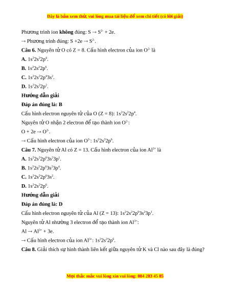 ơ trình ion không đúng: S S2- + 2e. Phư ng t ơ rình đúng: S +2e S2-. Câu 6. Nguyên t O ử có Z = 8. C u hì ấ nh electron c a ủ ion O2- là A. 1s22s22p4. B. 1s22s22p6. C. 1s22s22p43s2. D. 1s22s22p2. Hư ng d ớ ẫn gi i ả Đáp án đúng là: B