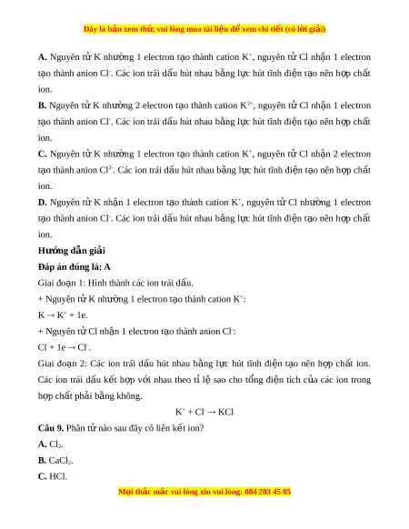 ớ nhau theo tỉ lệ sao cho t ng ổ đi n ệ tích c a ủ các ion trong h p ợ ch t ấ ph i ả b ng không. ằ K+ + Cl- KCl Câu 9. Phân t nào ử sau đây có liên k t ế ion? A. Cl2. B. CaCl2. C. HCl. M i ọ thắc m c