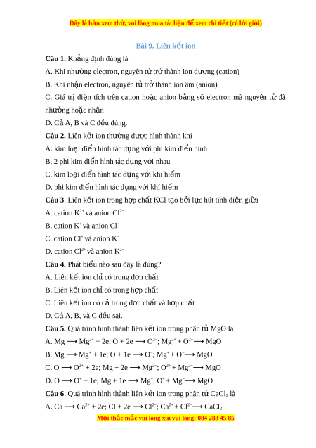 Đây là bản xem th , vu ử i lòng mua tài li u ệ đ xe ể m chi ti t ế (có l i ờ gi i ả ) Bài 9. Liên k t ế ion Câu 1. Kh ng đ ẳ ịnh đúng là A. Khi như ng el ờ ectron, nguyên t t ử r t ở hành ion dư ng ơ (cation) B. Khi nh n ậ electron, nguyên t t ử r t ở hành ion âm (anion) C. Giá trị đi n ệ tích trên cation ho c ặ anion b ng