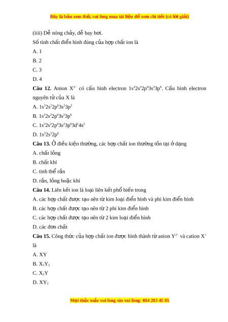 Đây là bản xem th , vu ử i lòng mua tài li u ệ đ xe ể m chi ti t ế (có l i ờ gi i ả ) (iiii) D nóng ch ễ y ả , dễ bay h i ơ . Số tính ch t ấ đi n hì ể nh đúng c a h ủ p ợ ch t ấ ion là A. 1 B. 2 C. 3 D. 4