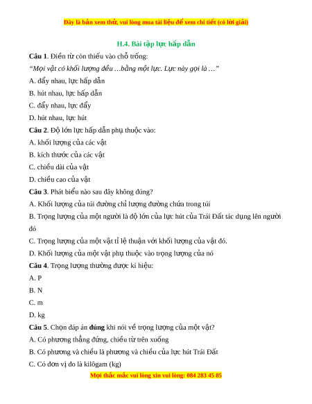 Đây là bản xem th , vu ử i lòng mua tài li u ệ đ xe ể m chi ti t (c ế ó l i ờ gi i ả ) H.4. Bài t p l ậ c h ự p d ấ n ẫ Câu 1. Đi n t ề ừ còn thi u vào ch ế ỗ trống: “M i ọ v t ậ có khối lư ng ợ đ u … ề b ng ằ m t ộ l c. L ự c ự này g i ọ là …” A. đẩy nhau, l c h ự ấp d n ẫ B. hút nhau, l c h ự p d ấ n ẫ C. đẩy nhau, l c đ ự ẩy D. hút nhau, l c ự hút Câu 2. Độ l n l ớ c h ự ấp dẫn ph t ụ hu c vào: ộ A. khối lư ng c ợ a ủ các v t ậ B. kích thư c c ớ a ủ các v t ậ C. chi u dài ề c a ủ v t ậ D. chi u ề cao c a v ủ t ậ