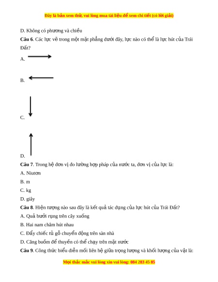 Đây là bản xem th , vu ử i lòng mua tài li u ệ đ xe ể m chi ti t (c ế ó l i ờ gi i ả ) D. Không có phư ng và chi ơ u ề Câu 6. Các l c v ự t ẽ rong m t ộ m t ặ ph ng ẳ dư i ớ đây, l c nào có ự th l ể à l c hút ự c a ủ Trái Đất? A. B. C. D.
