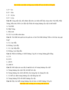 Câu 7. Trong hệ đ n v ơ ị đo lư ng h ờ p pháp ợ c a n ủ ư c ớ ta, đ n v ơ c ị a l ủ c l ự à: A. Niut n ơ B. m C. kg D. giây Câu 8. Hi n t ệ ư ng nào ợ sau đây là k t ế qu t ả ác d ng ụ c a l ủ c hút ự c a ủ Trái Đ t ấ ? A. Quả bư i ở r ng t ụ rên cây xu ng ố B. Hai nam châm hút nhau C. Đẩy chi c t ế g ủ ỗ chuy n đ ể ng t ộ rên sàn nhà D. Căng bu m ồ để thuy n có t ề h ch ể y ạ trên m t ặ nư c ớ Câu 9. Công th c bi ứ u di ể n m ễ ối liên h gi ệ a ữ tr ng l ọ ư ng ợ và kh i ố lư ng c ợ a v ủ t ậ là: M i ọ thắc m c