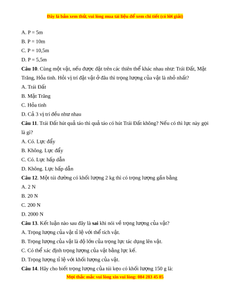 Đây là bản xem th , vu ử i lòng mua tài li u ệ đ xe ể m chi ti t (c ế ó l i ờ gi i ả ) A. P = 5m B. P = 10m C. P = 10,5m D. P = 5,5m Câu 10. Cùng m t ộ v t ậ , n u đ ế ư c ợ đ t