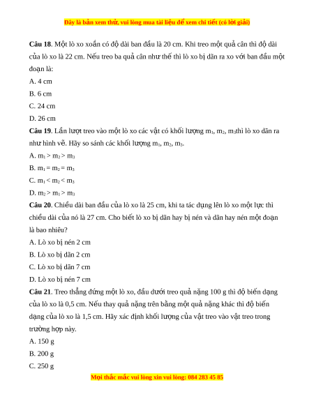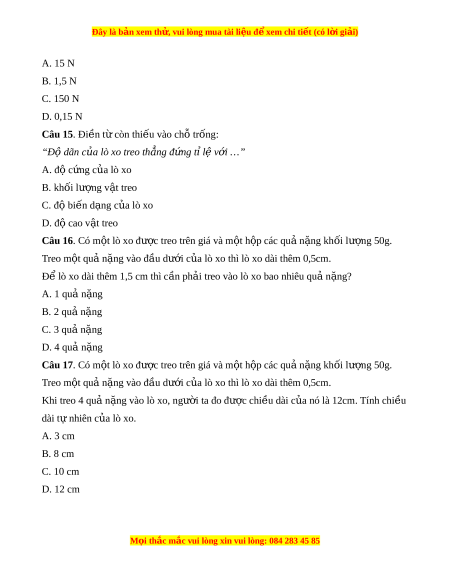 Đây là bản xem th , vu ử i lòng mua tài li u ệ đ xe ể m chi ti t (c ế ó l i ờ gi i ả ) A. 15 N B. 1,5 N C. 150 N D. 0,15 N Câu 15. Đi n t ề ừ còn thi u vào ch ế ỗ trống: “Đ dãn c ộ a ủ lò xo treo th ng ẳ đ ng t ứ l ỉ v ệ i ớ …” A. độ c ng c ứ a l ủ ò xo B. khối lư ng ợ v t ậ treo C. đ bi ộ n d ế ng ạ c a l ủ ò xo D. độ cao v t ậ treo Câu 16. Có m t ộ lò xo đư c t ợ reo trên giá và m t ộ h p các ộ qu n ả ng ặ kh i ố lư ng ợ 50g. Treo m t ộ qu n ả ng ặ vào đ u d ầ ư i ớ c a l