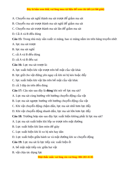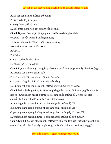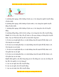 Câu 8: Xe ô tô bị sa lầy. Máy v n n ẫ ổ, bánh xe v n quay nh ẫ ng xe ư không d ch ị chuy n ể đư c. ợ T i ạ sao? Ph i ả làm th nào ế đ xe t ể hoát kh i ỏ vũng bùn? A. Do l c ự ma sát ngh gi ỉ a l ữ p xe và m ố t ặ đư ng ch ờ a đ ư ủ m nh đ ạ đ ể y đ ẩ ư c ợ xe đi. Cần tăng l c m ự a sát ngh . ỉ B. Do l c m ự a sát trư t ợ gi a l ữ ốp xe và m t ặ đư ng ờ ch a đ ư m ủ nh ạ đ đ ể y đ ẩ ư c xe đi ợ . Cần tăng l c m ự a sát trư t ợ . C. Do l c m ự a sát ngh g ỉ i a ữ l p xe ố và m t ặ đư ng ch ờ a ư đ m ủ nh ạ đ đ ể y đ ẩ ư c xe đi ợ . Cần gi m ả l c m ự a sát ngh . ỉ D. Do l c ự ma sát trư t ợ gi a l ữ p xe và m ố t ặ đư ng ch ờ a ư đ m ủ nh đ ạ đ ể y đ ẩ ư c ợ xe đi. Cần gi m ả l c m ự a sát trư t ợ . Câu 9: M t ộ ngư i ờ ra s c đ ứ y t ẩ hùng hàng mà nó v n đ ẫ ng yên. L ứ c nào cân ự b ng v ằ i ớ l c ự đ y c ẩ a ủ ngư i ờ và có tác d ng gì ụ ? A. L c m ự a sát ngh ; ỉ thúc đ y chuy ẩ n ể đ ng ộ B. L c ự ma sát ngh ; ỉ c n ả tr chuy ở n ể đ ng ộ C. L c ự ma sát trư t ợ ; thúc đ y chuy ẩ n đ ể ng ộ M i ọ thắc m c