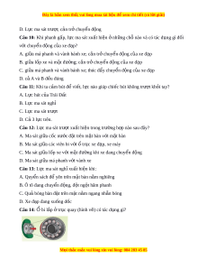 á phanh và vành bánh xe; thúc đ y chuy ẩ n đ ể ng c ộ a ủ xe đ p ạ D. cả A và B đ u đúng ề Câu 11: Khi ta c m ầ bút đ vi ể t ế , l c ự nào giúp chi c bút ế không trư t ợ kh i ỏ tay? A. L c hút ự c a ủ Trái Đất B. L c ự ma sát nghỉ C. L c ự ma sát trư t ợ D. C 3 l ả c t ự rên. Câu 12: L c ự ma sát trư t ợ xu t ấ hi n t ệ rong trư ng h ờ p nào s ợ au đây? A. Ma sát gi a ữ c c n ố ư c đ ớ t ặ trên m t ặ bàn v i ớ m t ặ bàn B. Ma sát gi a các ữ viên bi v i ớ t ổ r c xe ụ đ p, xe m ạ áy C. Ma sát gi a l ữ ốp xe v i ớ m t ặ đư ng khi ờ xe đang chuy n ể đ ng ộ D. Ma sát gi a ữ má phanh v i ớ vành xe Câu 13: L c ự ma sát ngh xu ỉ t ấ hi n khi ệ : A. Quy n ể sách để yên trên m t ặ bàn n m ằ nghiêng B. Ô tô đang chuy n đ ể ng, ộ đ t ộ ng t ộ hãm phanh C. Qu bóng bàn ả đ t ặ trên m t ặ n m ằ ngang nh n bóng ẵ D. Xe đ p đang xu ạ ống dốc Câu 14: Ổ bi l p ắ t ở r c quay ( ụ hình v ) ẽ có tác d ng ụ gì? M i ọ thắc m c