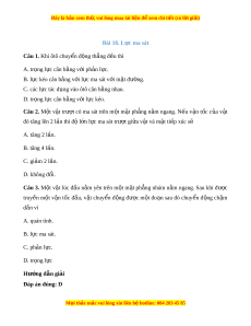 ế hệ số ma sát lăn gi a ữ bánh xe và m t ặ đư ng ờ là μ = 0,01. L y ấ g = 10 m/s2. Th i ờ gian t l ừ úc t t ắ xe máy đ n ế lúc d ng l ừ i ạ là A. 180 s. B. 90 s. C. 100 s. D. 150 s. Câu Đáp án Câu 1 Hư ng d ớ ẫn gi i ả Đáp án đúng: C Các l c ự tác d ng ụ lên xe ôtô bao g m ồ : tr ng ọ l c, ự ph n ả l c, ự l c ự kéo c a ủ đ ng ộ c , ơ l c ự ma sát v i ớ đư ng, ờ l c ự c n ả c a ủ không khí. Xe chuy n ể đ ng ộ th ng ẳ đ u khi ề các l c t ự ác d ng vào xe ụ cân b ng nhau. ằ Câu 2 Hư ng d ớ ẫn gi i ả Đáp án đúng: D L c m ự a sát F .N mst t , không ph t ụ hu c vào v ộ n ậ tốc c a v ủ t ậ . Câu 3 Hư ng d ớ ẫn gi i ả Đáp án đúng: D L c ự ma sát gây c n ả trở chuy n ể đ ng ộ c a ủ v t ậ , làm cho v t ậ chuy n ể M i