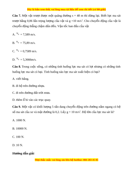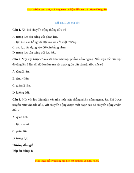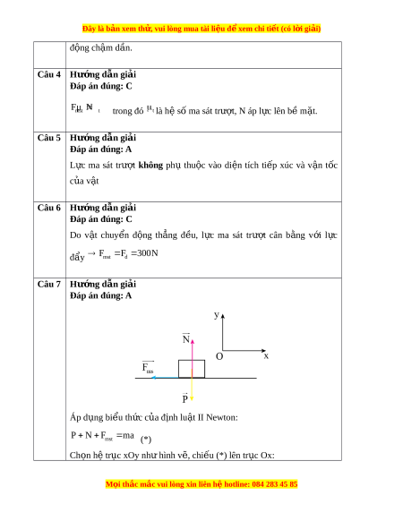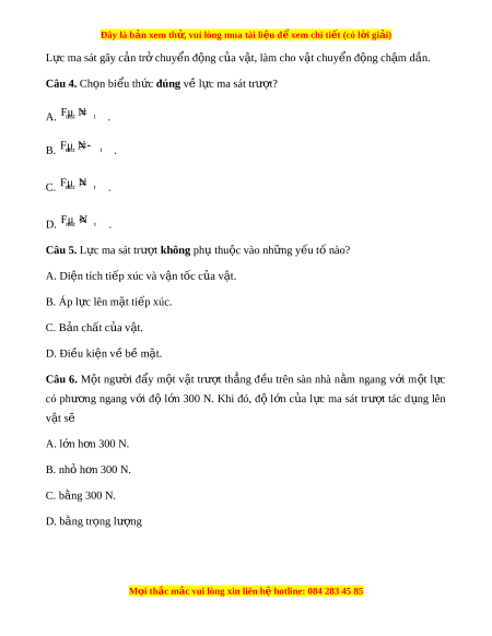 Đây là bản xem th , vu ử i lòng mua tài li u ệ đ xe ể m chi ti t (c ế ó l i ờ gi i ả ) L c m ự a sát gây c n ả tr chuy ở n ể đ ng c ộ a v ủ t ậ , làm cho v t ậ chuy n ể đ ng ch ộ m ậ d n. ầ Câu 4. Ch n ọ bi u t ể h c ứ đúng v l ề c m ự a sát trư t ợ ? A. Fμ N mst t . B. Fμ N mst t . C. Fμ N mst t . D. Fμ N mst t . Câu 5. L c m ự a sát trư t ợ không ph t ụ hu c ộ vào nh ng y ữ u t ế ố nào? A. Di n t ệ ích ti p xúc và ế v n t ậ c c ố a v ủ t ậ . B. Áp l c l ự ên m t ặ ti p xúc. ế C. B n ả ch t ấ c a ủ v t ậ . D. Đi u ề ki n v ệ b ề ề m t ặ . Câu 6. M t ộ ngư i ờ đ y ẩ m t ộ v t ậ trư t ợ th ng ẳ đ u ề trên sàn nhà n m ằ ngang v i ớ m t ộ l c ự có phư ng ơ ngang v i ớ độ l n ớ 300 N. Khi đó, đ ộ l n ớ c a ủ l c ự ma sát trư t ợ tác d ng ụ lên v t ậ sẽ A. l n ớ h n 300 N ơ . B. nh h ỏ n 300 N ơ . C. b ng 300 N ằ . D. b ng ằ tr ng ọ lư ng ợ M i