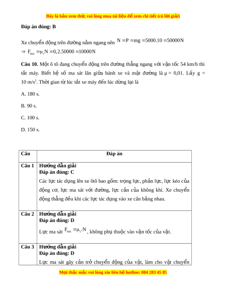 Đây là bản xem th , vu ử i lòng mua tài li u ệ đ xe ể m chi ti t (c ế ó l i ờ gi i ả ) Đáp án đúng: B Xe chuy n đ ể ng t ộ rên đư ng n ờ m ằ ngang nên N P m g 5 000.10 5 0000N F N 0 , 2.50000 1 0000N mst t Câu 10. M t ộ ô tô đang chuy n ể đ ng ộ trên đư ng ờ th ng ẳ ngang v i ớ v n ậ t c ố 54 km/h thì t t ắ máy. Bi t