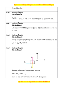 D. thêm ổ bi vào các tr c quay ụ . Câu 9. M t ộ v t ậ có kh i ố lư ng ợ 5 t n ấ đang chuy n ể đ ng ộ trên đư ng ờ n m ằ ngang có hệ số ma sát c a ủ xe và m t ặ đư ng ờ là 0,2. L y g = 10 m ấ /s2. Đ l ộ n c ớ a ủ l c m ự a sát là? A. 1000 N. B. 10000 N. C. 100 N. D. 10 N. Hư ng d ớ ẫn gi i ả M i