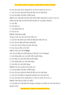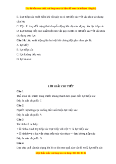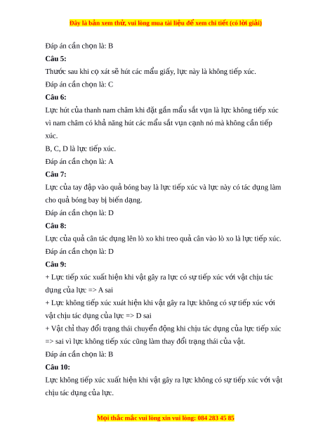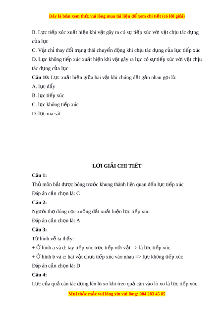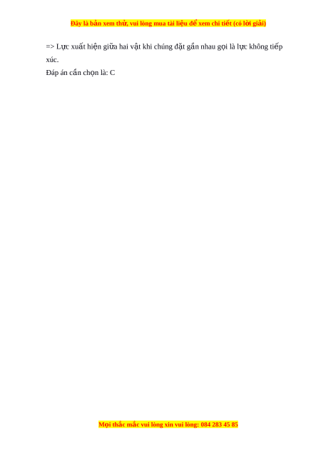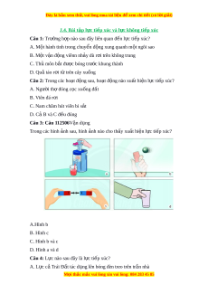 ậ gây ra có sự ti p xúc v ế i ớ v t ậ ch u t ị ác d ng ụ c a l ủ c ự C. V t ậ chỉ thay đổi tr ng t ạ hái chuy n ể đ ng khi ộ ch u t ị ác d ng c ụ a ủ l c t ự i p xúc ế D. L c ự không ti p ế xúc xu t ấ hi n khi ệ v t ậ gây ra l c ự có sự ti p ế xúc v i ớ v t ậ ch u ị tác d ng c ụ a ủ l c ự Câu 10: L c xu ự ất hi n g ệ i a ữ hai v t ậ khi chúng đ t ặ g n nhau g ầ i ọ là: A. l c đ ự ẩy B. l c ự ti p ế xúc C. l c ự không ti p ế xúc D. l c m ự a sát L I Ờ GIẢI CHI TI T Ế Câu 1: Th m ủ ôn b t ắ đư c bóng t ợ rư c khung t ớ hành liên quan đ n l ế c t ự i p xúc ế Đáp án cần ch n ọ là: C Câu 2: Ngư i ờ th đóng c ợ c ọ xu ng đ ố t ấ xu t ấ hi n l ệ c t ự i p xúc. ế Đáp án cần ch n ọ là: A Câu 3: T hì ừ nh vẽ ta th y: ấ + hì