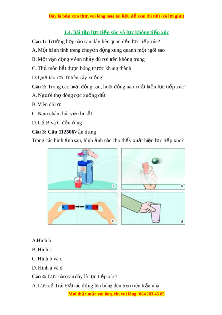 Đây là bản xem th , vu ử i lòng mua tài li u ệ đ xe ể m chi ti t ế (có l i ờ gi i ả ) J.4. B ài t p l ậ c t ự i p x ế úc và l c không t ự i p xúc ế Câu 1: Trư ng h ờ p nào s ợ au đây liên quan đ n l ế c ự ti p xúc? ế A. M t ộ hành tinh trong chuy n đ ể ng ộ xung quanh m t ộ ngôi sao B. M t ộ v n đ ậ ng ộ viênn nh y dù r ả i ơ trên không trung C. Th m ủ ôn b t ắ đư c ợ bóng trư c ớ khung thành D. Qu t ả áo r i ơ t t ừ rên cây xu ng ố Câu 2: Trong các ho t ạ đ ng ộ sau, ho t ạ đ ng nào xu ộ t ấ hi n l ệ c t ự i p xúc? ế A. Ngư i ờ th đóng c ợ c ọ xu ng đ ố t ấ B. Viên đá r i ơ C. Nam châm hút viên bi s t ắ D. Cả B và C đ u đúng ề