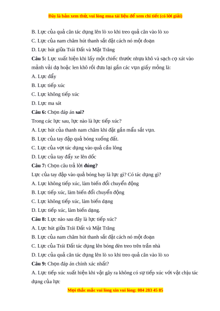 Đây là bản xem th , vu ử i lòng mua tài li u ệ đ xe ể m chi ti t ế (có l i ờ gi i ả ) Đáp án cần ch n ọ là: B Câu 5: Thư c ớ sau khi cọ xát s hút ẽ các m u gi ẩ y ấ , l c này l ự à không ti p xúc. ế Đáp án cần ch n ọ là: C Câu 6: L c ự hút c a t ủ hanh nam châm khi đ t ặ g n m ầ u s ẩ t ắ v n l ụ à l c ự không ti p ế xúc
