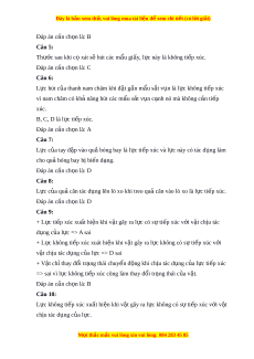 vì nam châm có khả năng hút các m u s ẩ t ắ v n c ụ nh ạ nó mà không c n t ầ i p ế xúc. B, C, D là l c t ự i p xúc. ế Đáp án cần ch n ọ là: A Câu 7: L c ự c a t ủ ay đ p ậ vào qu bóng bay ả là l c t ự i p xúc và l ế c này ự có tác d ng l ụ àm cho qu bóng bay ả bị bi n d ế ng. ạ Đáp án cần ch n ọ là: D Câu 8: L c ự c a qu ủ ả cân tác d ng l ụ ên lò xo khi treo qu cân ả vào lò xo là l c t ự i p xúc. ế Đáp án cần ch n ọ là: D Câu 9: + L c ự ti p ế xúc xu t ấ hi n khi ệ v t ậ gây ra l c ự có s t ự i p xúc ế v i ớ v t ậ ch u t ị ác d ng c ụ a l ủ c ự => A sai + L c ự không ti p ế xúc xuát hi n kh ệ i v t ậ gây ra l c không có s ự t ự i p xúc v ế i ớ v t ậ chịu tác d ng ụ c a l ủ c => D ự sai + V t ậ ch t ỉ hay đ i ổ tr ng t ạ hái chuy n ể đ ng khi ộ ch u t ị ác d ng c ụ a ủ l c t ự i p xúc ế => sai vì l c không t ự i p xúc ế cũng làm thay đ i ổ tr ng t ạ hái c a ủ v t ậ . Đáp án cần ch n ọ là: B Câu 10: L c ự không ti p ế xúc xu t ấ hi n khi ệ v t ậ gây ra l c ự không có sự ti p ế xúc v i ớ v t ậ chịu tác d ng c ụ a ủ l c. ự M i