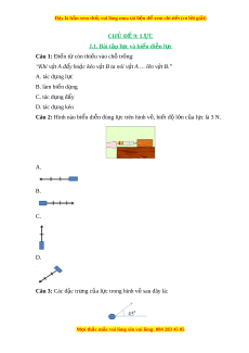 Đây là bản xem th , vu ử i lòng mua tài li u ệ đ xe ể m chi ti t ế (có l i ờ gi i ả ) CH Đ Ủ Ề 9: L C Ự J.1. B ài t p l ậ c và bi ự u di ể n l ễ c ự Câu 1: Đi n t ề ừ còn thi u vào ch ế ỗ trống: “Khi v t ậ A đ y ho ẩ c ặ kéo v t ậ B ta nói v t ậ A … lên v t ậ B.” A. tác d ng l ụ c ự B. làm bi n d ế ng ạ C. tác d ng đ ụ y ẩ D. tác d ng kéo ụ Câu 2: Hình nào bi u ể di n ễ đúng l c t ự rên hình v , bi ẽ t ế đ l ộ n c ớ a l ủ c l ự à 3 N. A. B. C. D. Câu 3: Các đ c ặ tr ng c ư a ủ l c t ự rong hình v s ẽ au đây là: M i