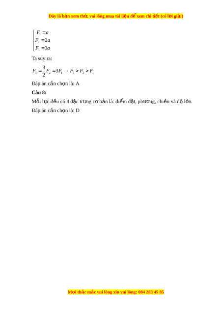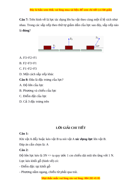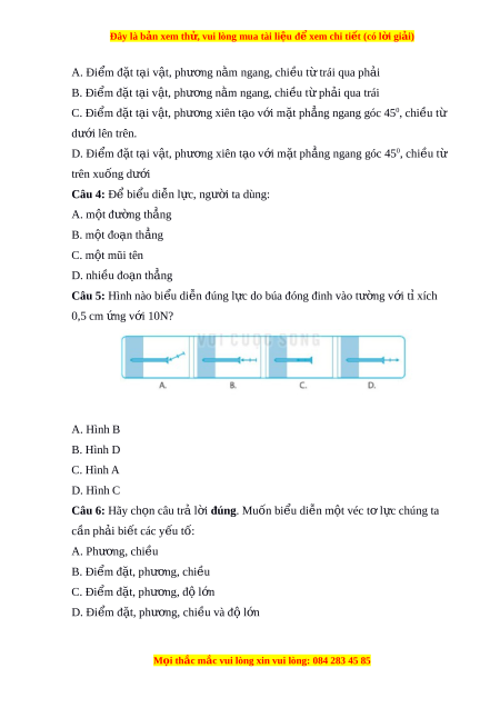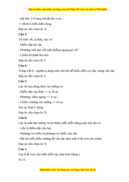 Đây là bản xem th , vu ử i lòng mua tài li u ệ đ xe ể m chi ti t ế (có l i ờ gi i ả ) - Độ l n: ớ 3 N ng v ứ i ớ đ dài ộ 3 cm. => Hình A bi u di ể n đúng. ễ Đáp án cần ch n ọ là: A Câu 3: T hì ừ nh vẽ, ta th y ấ , l c có: ự - Đi m ể đ t ặ t i ạ v t ậ - Phư ng ơ xiên t o v ạ i ớ m t ặ ph ng ngang góc 45 ẳ 0 - Chi u ề t d ừ ư i ớ lên trên. Đáp án cần ch n ọ là: C Câu 4: Trong V t ậ lí, ngư i ờ ta dùng m t ộ mũi tên đ bi ể u di ể n ễ các đ c ặ tr ng c ư a ủ l c. ự Đáp án cần ch n ọ là: C Câu 5: L c