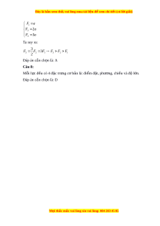 ự do búa đóng đinh vào tư ng có: ờ - Đi m ể đ t ặ : t i ạ đinh => A, B sai - Phư ng: ơ n m ằ ngang => A sai - Chi u: ề hư ng vào t ớ ư ng ờ => D sai Suy ra: hình C đúng Đáp án cần ch n ọ là: D Câu 6: L c ự là m t ộ đ i ạ lư ng ợ vect đ ơ ư c ợ bi u di ể n b ễ ng m ằ t ộ mũi tên có: - Gốc là đi m ể đ t ặ c a l ủ c. ự - Phư ng ơ và chi u l ề à phư ng ơ và chi u c ề a l ủ c. ự - Độ dài bi u di ể n c ễ ư ng ờ đ c ộ a l ủ c ự theo m t ộ t l ỉ xí ệ ch cho trư c. ớ Đáp án cần ch n ọ là: D Câu 7: G i ọ tỉ l xí ệ ch c a bi ủ u di ể n l ễ c nh ự ư hình b ng a ằ Ta có: M i