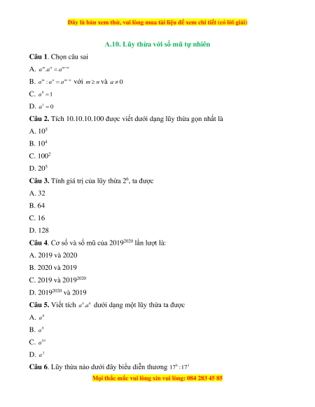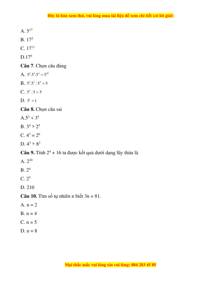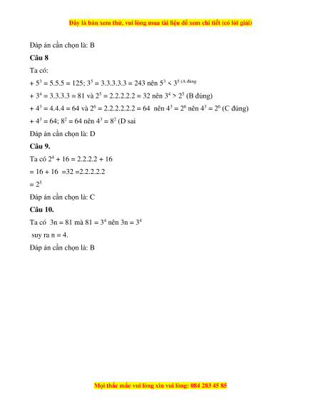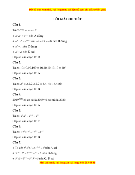 20192020 có cơ số là 2019 và số mũ là 2020. Đáp án cần chọn là: A Câu 5. Ta có 4 6 4+6 10 a .a = a = a Đáp án cần chọn là: C Câu 6. Ta có: 8 3 8−3 5 17 :17 = 17 = 17 Đáp án cần chọn là: B Câu 7. + Ta có: 2 3 4 2+3+4 9 5 .5 .5 = 5 = 5 nên A sai + 2 3 4 2+3+4 1 5 .5 : 5 = 5 = 5 = 5 nên B đúng + 3 3 1 − 2 1 5 : 5 = 5 = 5 ;5 = 5 nên C, D sai