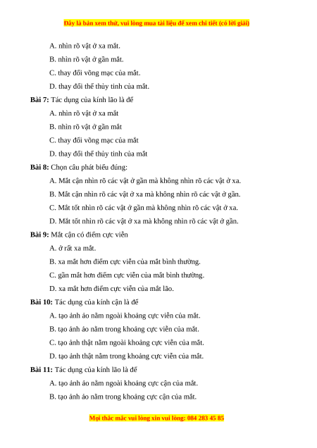 Bài 9: Mắt cận có điểm cực viễn A. ở rất xa mắt.