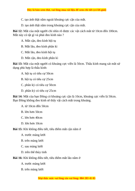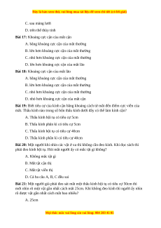 Bài 15: Khi không điều tiết, tiêu điểm mắt cận nằm ở A. trước màng lưới B. trên màng lưới C. sau màng lưới D. trên thể thủy tinh