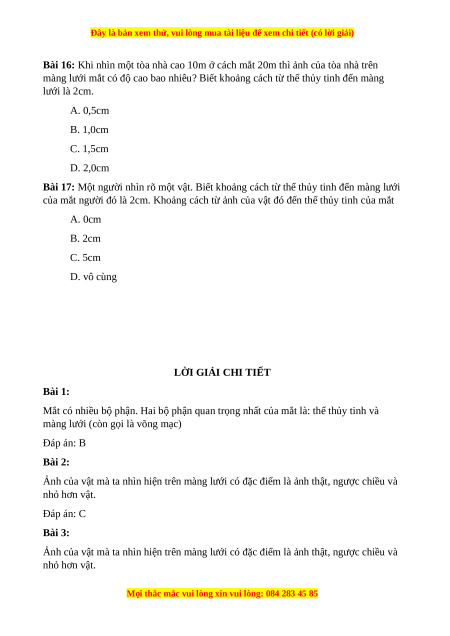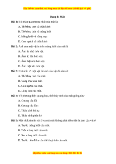 của mắt người đó là 2cm. Khoảng cách từ ảnh của vật đó đến thể thủy tinh của mắt A. 0cm B. 2cm C. 5cm D. vô cùng LỜI GIẢI CHI TIẾT Bài 1:
