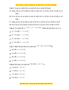 ề "x Î ¡ , x +x +5>0 là: 2 A. x , x x 5 0 ; 2 B. x , x x 5 0 ; 2 C. x , x x 5 0 ; 2 D. x , x x 5 0 . 2 Câu 8. Ph đ ủ nh c ị a m ủ nh đ ệ ề " x , 5x 3x 1 " là 2 A. " x , 5x 3x 1 " ; 2 B. " x , 5x 3x 1 "; 2 C. " x , 5x 3x 1 "; 2 D. " x , 5x 3x 1 " . M i