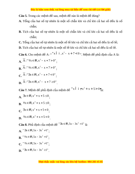 , x x 7 0" ; 2 D. A :" x , x x 7 0 ". 2 Câu 7. Mệnh đ ph ề ủ định c a ủ m nh đ ệ
