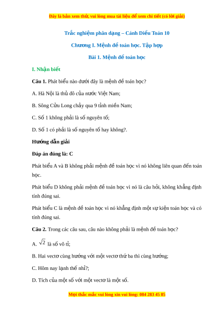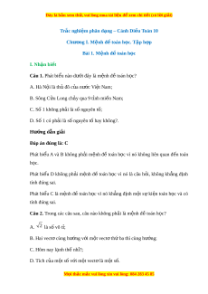 Đây là bản xem th , vu ử i lòng mua tài li u ệ đ xe ể m chi ti t ế (có l i ờ gi i ả ) Trắc nghi m ệ phân d ng – C ạ ánh Di u ề Toán 10 Chư ng ơ I. M nh đ ệ t ề oán h c. ọ T p h ậ p ợ Bài 1. M nh đ ệ t ề oán h c ọ I. Nhận bi t ế