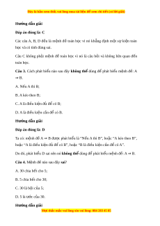 Đây là bản xem th , vu ử i lòng mua tài li u ệ đ xe ể m chi ti t (c ế ó l i ờ gi i ả ) Hư ng d ớ ẫn gi i ả Đáp án đúng là: C Các câu A, B, D đ u ề là m nh ệ đ ề toán h c ọ vì nó kh ng ẳ đ nh ị m t ộ s ự ki n ệ toán h c ọ và có tính đúng sai. Câu C không ph i ả m nh ệ đề toán h c ọ vì nó là câu h i ỏ và không liên quan đ n ế toán h c. ọ