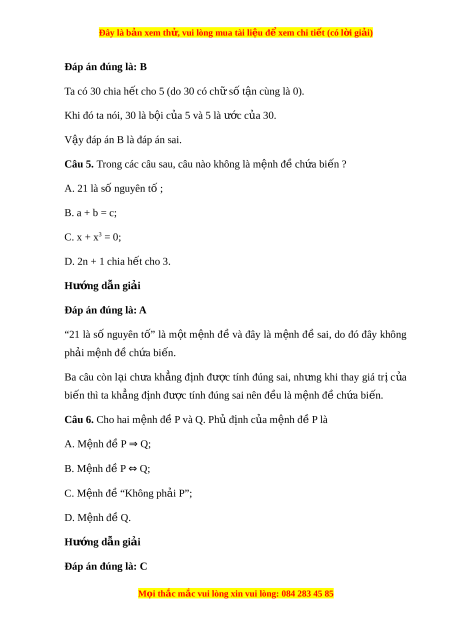 Đây là bản xem th , vu ử i lòng mua tài li u ệ đ xe ể m chi ti t ế (có l i ờ gi i ả ) Đáp án đúng là: B Ta có 30 chia h t ế cho 5 (do 30 có ch s ữ ố t n cùng l ậ à 0). Khi đó ta nói, 30 là b i ộ c a ủ 5 và 5 là ư c c ớ a ủ 30. V y đáp ậ án B là đáp án sai.