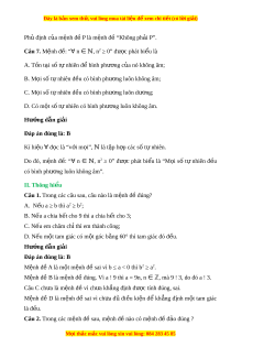 Đây là bản xem th , vu ử i lòng mua tài li u ệ đ xe ể m chi ti t (c ế ó l i ờ gi i ả ) Ph đ ủ nh c ị a ủ m nh đ ệ P ề là m nh đ ệ “K ề hông ph i ả P”. Câu 7. Mệnh đ : ề “∀ n ∈ , n ℕ 2 ≥ 0” đư c ợ phát bi u l ể à A. Tồn t i ạ số t nhi ự ên đ bì ể nh phư ng c ơ a ủ nó không âm; B. M i ọ số t nhi ự ên đ u có bì ề nh phư ng l ơ uôn không âm; C. M i ọ số t nhi ự ên đ u có bì ề nh phư ng l ơ uôn dư ng; ơ D. Có m t ộ số t nhi ự ên có bình phư ng ơ luôn không âm. Hư ng d ớ ẫn gi i ả Đáp án đúng là: B Kí hi u ệ ∀ đ c ọ là “v i ớ m i ọ ”, l ℕ à t p ậ h p các ợ s t ố nhi ự ên. Do đó, m nh ệ đ : ề “∀ n ∈ , ℕ n2 ≥ 0” đư c ợ phát bi u ể là “M i ọ số tự nhiên đ u ề có bình phư ng ơ luôn không âm”. II. Thông hi u ể