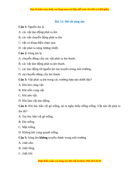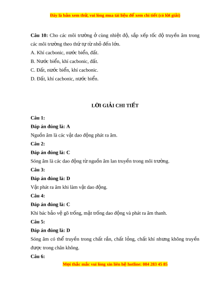 D. Đất, khí cacbonic, nư c ớ bi n. ể LỜI GIẢI CHI TI T Ế Câu 1: Đáp án đúng là: A Nguồn âm là các v t ậ dao đ ng phát ộ ra âm. Câu 2: Đáp án đúng là: C Sóng âm là các dao đ ng ộ t ngu ừ n âm ồ lan truy n t ề rong môi trư ng. ờ Câu 3: Đáp án đúng là: D V t ậ phát ra âm khi làm v t ậ dao đ ng. ộ Câu 4: Đáp án đúng là: C Khi bác b o ả v gõ t ệ rống, m t ặ tr ng dao đ ố ng ộ và phát ra âm thanh. Câu 5: Đáp án đúng là: D Sóng âm có thể truy n ề trong ch t ấ r n, ắ ch t ấ l ng, ỏ ch t ấ khí nh ng ư không truy n ề đư c t ợ rong chân không. Câu 6: M i