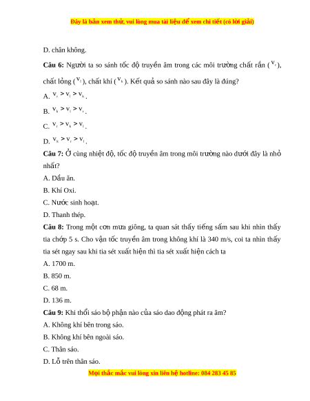 ả o sánh nào sau đây là đúng? A. v v v r l k . B. v v v k l r . C. v v v r k l . D. v v v k r l . Câu 7: Ở cùng nhi t ệ đ , ộ t c ố độ truy n ề âm trong môi trư ng ờ nào dư i ớ đây là nhỏ nh t ấ ? A. Dầu ăn. B. Khí Oxi. C. Nư c ớ sinh ho t ạ . D. Thanh thép. Câu 8: Trong m t ộ c n ơ m a ư giông, ta quan sát th y ấ ti ng ế s m ấ sau khi nhìn th y ấ tia ch p ớ 5 s. Cho v n ậ t c ố truy n