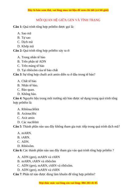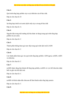 Câu 1: Quá trình tổng hợp prôtêin được gọi là: A. Sao mã B. Tự sao C. Dịch mã D. Khớp mã