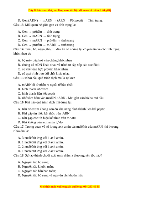 Câu 18: Sự tạo thành chuỗi axít amin diễn ra theo nguyên tắc nào? A. Nguyên tắc bổ sung;
