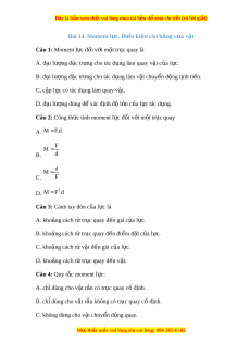 Đây là bản xem th , vu ử i lòng mua tài li u ệ đ xe ể m chi ti t ế (có l i ờ gi i ả ) Bài 14. Moment l c. Đ ự i u ki ề n cân b ệ ng c ằ a v ủ t ậ Câu 1: Moment l c đ ự ối v i ớ m t ộ tr c ụ quay là A. đ i ạ lư ng ợ đ c t ặ r ng cho t ư ác d ng ụ làm quay v t ậ c a ủ l c. ự B. đ i ạ lư ng đ ợ c ặ tr ng cho t ư ác d ng l ụ àm v t ậ chuy n ể đ ng t ộ nh t ị i n. ế C. c p ặ l c có t ự ác d ng l ụ àm quay v t ậ . D. đ i ạ lư ng ợ đùng đ xác đ ể nh đ ị l ộ n c ớ a ủ l c t ự ác d ng. ụ Câu 2: Công th c t ứ ính moment l c đ ự i ố v i ớ m t ộ tr c ụ quay A. M F .d F M B. d d M C. F D. 2 M F .d