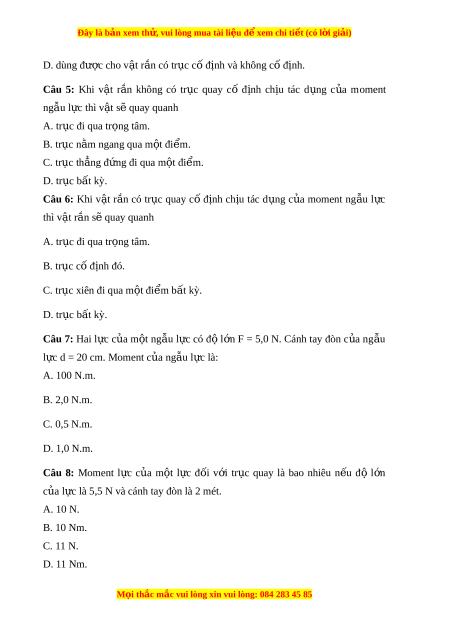 Đây là bản xem th , vu ử i lòng mua tài li u ệ đ xe ể m chi ti t (c ế ó l i ờ gi i ả ) D. dùng đư c ợ cho v t ậ r n có t ắ r c ụ c đ ố nh và không c ị đ ố nh. ị Câu 5: Khi v t ậ r n ắ không có tr c ụ quay cố đ nh ị ch u ị tác d ng ụ c a ủ moment ngẫu l c t ự hì v t ậ s quay quanh ẽ A. tr c đi ụ qua tr ng t ọ âm. B. tr c ụ n m ằ ngang qua m t ộ đi m ể . C. tr c ụ th ng ẳ đ ng đi ứ qua m t ộ đi m ể . D. tr c b ụ ất kỳ. Câu 6: Khi v t ậ r n ắ có tr c ụ quay cố đ nh ị ch u ị tác d ng ụ c a ủ moment ng u ẫ l c ự thì v t ậ r n s ắ quay quanh ẽ A. tr c đi ụ qua tr ng t ọ âm. B. tr c ụ c đ ố nh đó. ị C. tr c ụ xiên đi qua m t ộ đi m ể b t ấ kỳ. D. tr c b ụ ất kỳ. Câu 7: Hai l c ự c a ủ m t ộ ng u ẫ l c ự có đ ộ l n