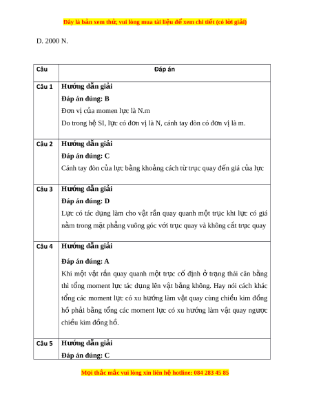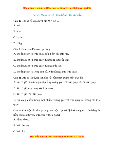 Đây là bản xem th , vu ử i lòng mua tài li u ệ đ xe ể m chi ti t (c ế ó l i ờ gi i ả ) Bài 21. Moment l c. C ự ân b ng c ằ a v ủ t ậ r n ắ Câu 1: Đ n v ơ ị c a m ủ oment l c ự M = F.d là A. m/s. B. N.m. C. kg.m. D. N.kg.