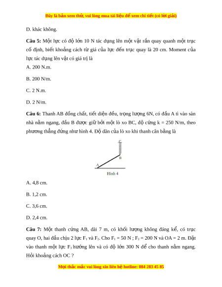 Đây là bản xem th , vu ử i lòng mua tài li u ệ đ xe ể m chi ti t (c ế ó l i ờ gi i ả ) D. khác không. Câu 5: M t ộ l c ự có độ l n ớ 10 N tác d ng ụ lên m t ộ v t ậ r n ắ quay quanh m t ộ tr c ụ cố định, bi t ế kho ng ả cách từ giá c a ủ l c ự đ n ế tr c ụ quay là 20 cm. Moment c a ủ l c ự tác d ng l ụ ên v t ậ có giá tr l ị à A. 200 N.m. B. 200 N/m. C. 2 N.m. D. 2 N/m. Câu 6: Thanh AB đ ng ồ ch t ấ , ti t ế di n ệ đ u, ề tr ng ọ lư ng ợ 6N, có đ u ầ A tì vào sàn nhà n m ằ ngang, đ u ầ B đư c ợ giữ b i ở m t ộ lò xo BC, độ c ng ứ k = 250 N/m, theo phư ng ơ th ng đ ẳ ng nh ứ hì ư nh 4. Độ dãn c a l