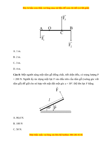 Đây là bản xem th , vu ử i lòng mua tài li u ệ đ xe ể m chi ti t (c ế ó l i ờ gi i ả ) A. 1 m. B. 2 m. C. 3 m. D. 4 m. Câu 8: M t ộ ngư i ờ nâng m t ộ t m ấ gỗ đ ng ồ ch t ấ , ti t ế di n ệ đ u, ề có tr ng ọ lư ng ợ P = 200 N. Ngư i ờ y ấ tác d ng ụ m t ộ l c ự F vào đ u ầ trên c a ủ t m ấ g ỗ (vuông góc v i ớ tấm g ) ỗ đ gi ể cho ữ nó h p v ợ i ớ m t ặ đ t ấ m t ộ góc a = 30°. Đ l ộ n l ớ c F b ự ng ằ A. 86,6 N. B. 100 N C. 50 N. M i