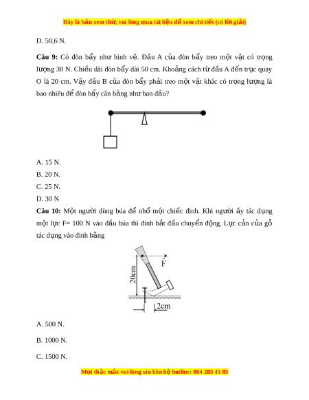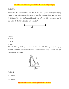 Đây là bản xem th , vu ử i lòng mua tài li u ệ đ xe ể m chi ti t (c ế ó l i ờ gi i ả ) D. 50,6 N. Câu 9: Có đòn b y ẩ như hình v . ẽ Đ u ầ A c a ủ đòn b y ẩ treo m t ộ v t ậ có tr ng ọ lư ng ợ 30 N. Chi u ề dài đòn b y ẩ dài 50 cm. Kho ng ả cách t ừ đ u ầ A đ n ế tr c ụ quay O là 20 cm. V y ậ đ u ầ B c a ủ đòn b y ẩ ph i ả treo m t ộ v t ậ khác có tr ng ọ lư ng ợ là bao nhiêu đ đòn b ể y cân ẩ b ng nh ằ ban ư đ u? ầ A. 15 N. B. 20 N. C. 25 N. D. 30 N Câu 10: M t ộ ngư i ờ dùng búa để nhổ m t ộ chi c ế đinh. Khi ngư i ờ y ấ tác d ng ụ m t ộ l c ự F= 100 N vào đ u ầ búa thì đinh b t ắ đ u ầ chuy n ể đ ng. ộ L c ự c n ả c a ủ gỗ tác d ng vào đi ụ nh b ng ằ A. 500 N. B. 1000 N. C. 1500 N. M i