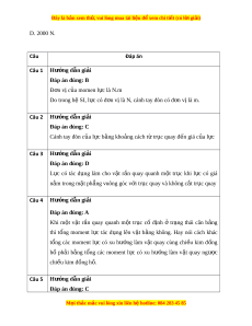 Câu 2: Cánh tay đòn c a ủ l c b ự ng ằ A. kho ng ả cách t t ừ r c quay đ ụ n ế đi m ể đ t ặ c a ủ l c. ự B. kho ng cách ả t t ừ r c ụ quay đ n t ế r ng ọ tâm c a v ủ t ậ . C. kho ng cách ả t t ừ r c ụ quay đ n gi ế á c a ủ l c. ự D. kho ng ả cách t t ừ rong tâm c a v ủ t ậ đ n gi ế á c a ủ tr c quay ụ . Câu 3: L c ự có tác d ng l ụ àm cho v t ậ r n quay quanh m ắ t ộ tr c khi ụ A. l c ự có giá n m ằ trong m t ặ ph ng ẳ vuông góc v i ớ tr c ụ quay và c t ắ tr c ụ quay B. l c có gi ự á song song v i ớ tr c quay ụ C. l c có gi ự á c t ắ tr c ụ quay D. l c ự có giá n m ằ trong m t ặ ph ng ẳ vuông góc v i ớ tr c ụ quay và không c t ắ tr c ụ quay Câu 4: Khi m t ộ v t ậ r n ắ quay quanh m t ộ tr c ụ cố đ nh ị ở tr ng ạ thái cân b ng ằ thì tổng moment l c t ự ác d ng l ụ ên v t ậ có giá trị A. b ng ằ không. B. luôn dư ng. ơ C. luôn âm. M i