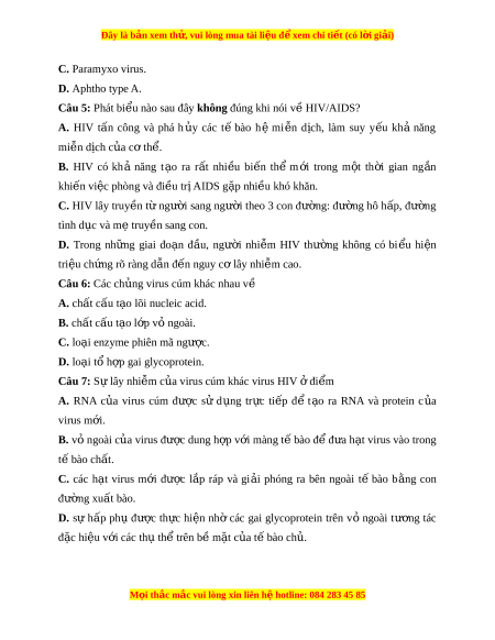 Đây là bản xem th , vu ử i lòng mua tài li u ệ đ xe ể m chi ti t (c ế ó l i ờ gi i ả ) C. Paramyxo virus. D. Aphtho type A. Câu 5: Phat bi u nao s ê