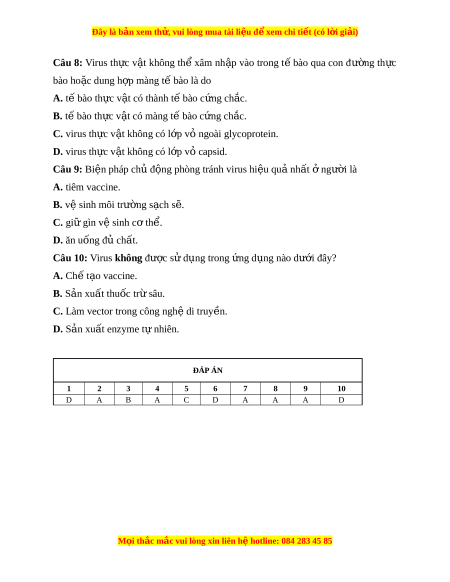 Đây là bản xem th , vu ử i lòng mua tài li u ệ đ xe ể m chi ti t (c ế ó l i ờ gi i ả ) Câu 8: Virus th c ư v t â không th ê xâm nh p â vao trong t ê bao qua con đư ng ơ th c ư bao ho c dung h ă p m ơ ang t bao l ê a do A. t bao ê th c ư v t â co thanh t bao c ê ng ch ư c. ă B. t bao t ê h c v ư t â co mang t bao c ê ng ư ch c. ă C. virus th c ư v t â không co l p v ơ ngoai o glycoprotein. D. virus th c ư v t â không co l p v ơ caps o id.