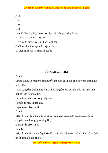 Đây là bản xem th , vu ử i lòng mua tài li u ệ đ xe ể m chi ti t ế (có l i ờ gi i ả ) A. 2 B. 4 C. 6 D. 8 Câu 10: Trư ng h ờ p nào d ợ ư i ớ đây v t ậ không có năng lư ng: ợ A. T ng đá n ả m ằ trên m t ặ đ t ấ B. T ng đá đ ả ược nâng lên kh i ỏ m t ặ đ t ấ C. Chi c ế thuy n ch ề y ạ trên m t ặ nư c ớ D. Viên ph n r ấ i ơ t t ừ rên bàn xu ng ố L I Ờ GIẢI CHI TI T Ế Câu 1: Chúng ta nh n ậ bi t ế đi n năng t ệ ừ c ổ m ắ đi n cung c ệ p cho m ấ áy tính thông qua bi u hi ể ện: - Ánh sáng t m