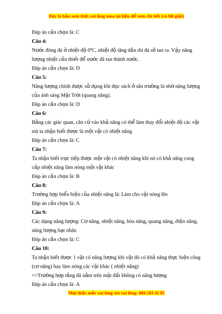 Đây là bản xem th , vu ử i lòng mua tài li u ệ đ xe ể m chi ti t ế (có l i ờ gi i ả ) Đáp án cần ch n ọ là: C Câu 4: Nư c đóng đá ớ nhi ở t ệ đ 0 ộ 0C, nhi t ệ độ tăng d n t ầ hì đá sẽ tan ra. V y ậ năng lư ng nhi ợ t ệ c n t ầ hi t ế đ n ể ư c đá ớ tan thành nư c. ớ Đáp án cần ch n ọ là: D Câu 5: Năng lư ng chí ợ nh được sử d ng khi ụ đ c s ọ ách s ở ân trư ng ờ là nh năng l ờ ư ng ợ c a ánh s ủ áng M t ặ Tr i ờ (quang năng). Đáp án cần ch n ọ là: D Câu 6: B ng